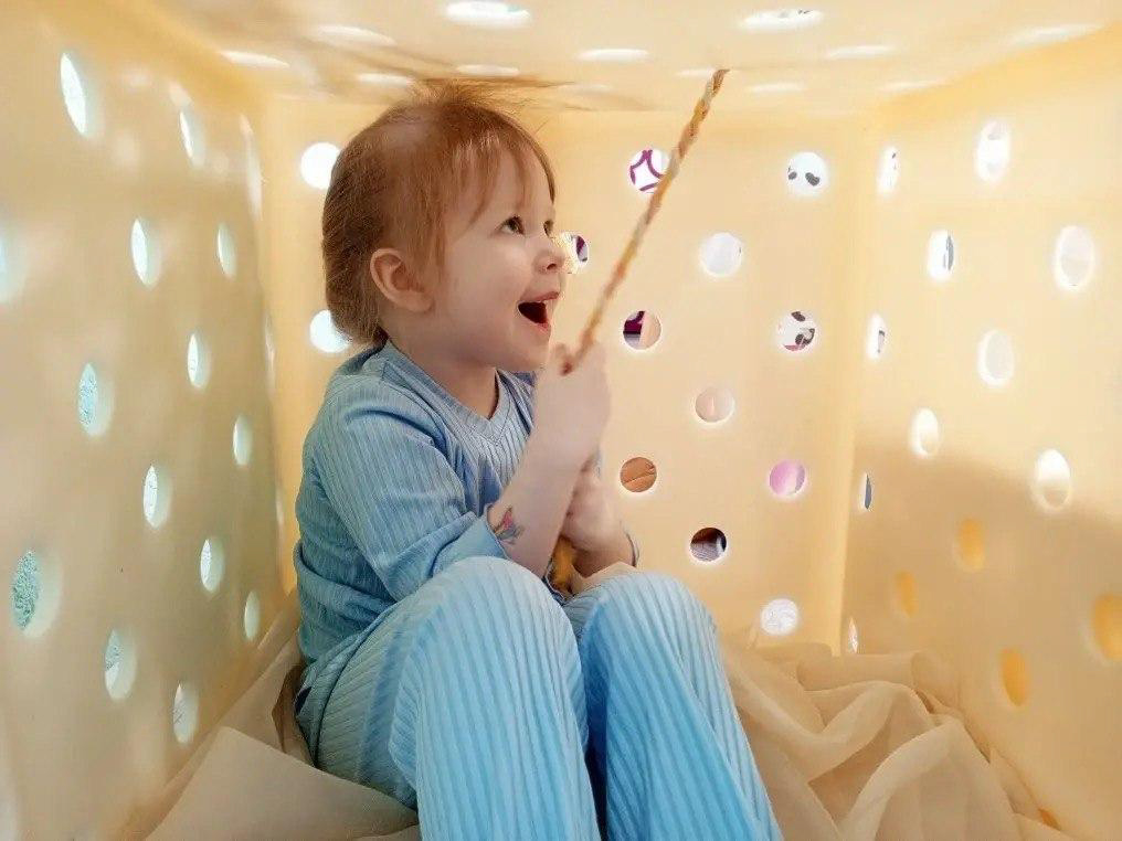 сначала дети договариваются — обсуждают, кто что будет делать, как соединять детали, где будет вход, где «главное место». Затем начинается активное строительство: сдвигают элементы, соединяют их, используют дополнительные материалы — ткани, верёвки.