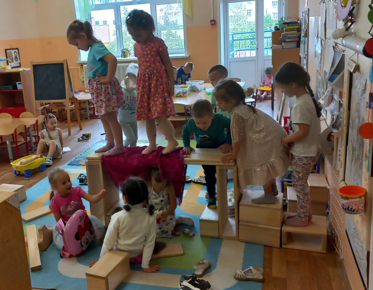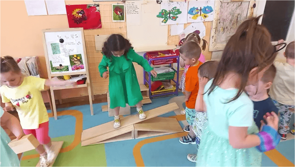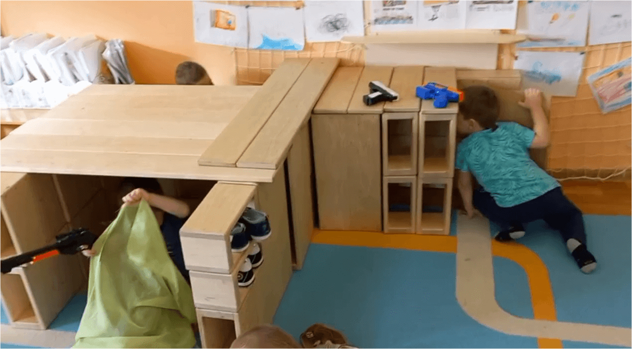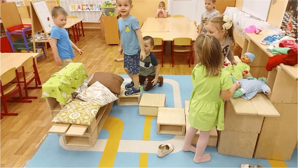 Постройки из полых блоков стимулируют переход от сенсомоторных действий к образной игре. Ребёнок не просто строит — он начинает «жить» в постройке, превращая её в сюжетное пространство для ролевых игр.